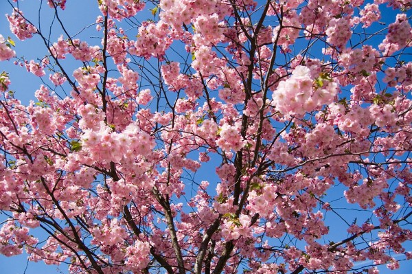 třešeň, pod kterou je jen zelená tráva a na ní v mých představách ležím já