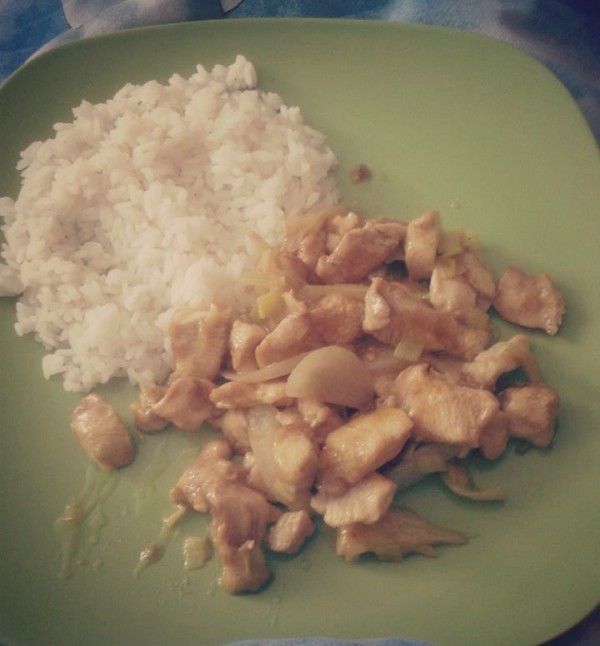 Domácí "čína". Kuřecí maso s pórkem a k tomu asi nejlepší ingrediencí je rýže. Klidně není problém dát si ji jen se zeleninovým mixem. :)