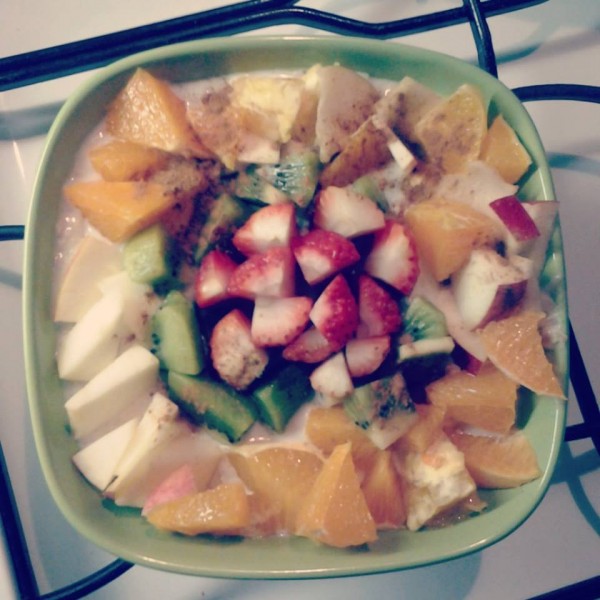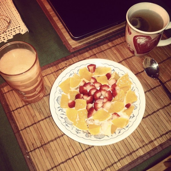 Ovesná kaše s jahodami, pomerančem a skořicí vmíchanou při vaření kaše. :) K tomu vynikajicí zelený čaj a vitamín C.